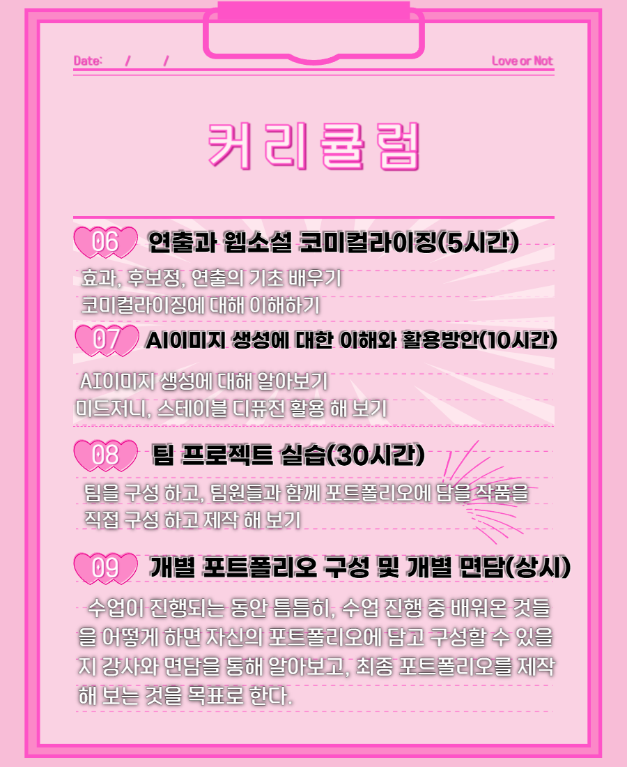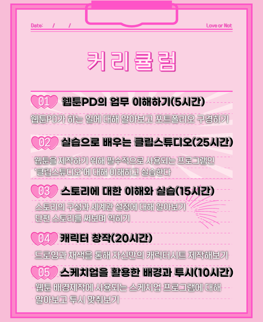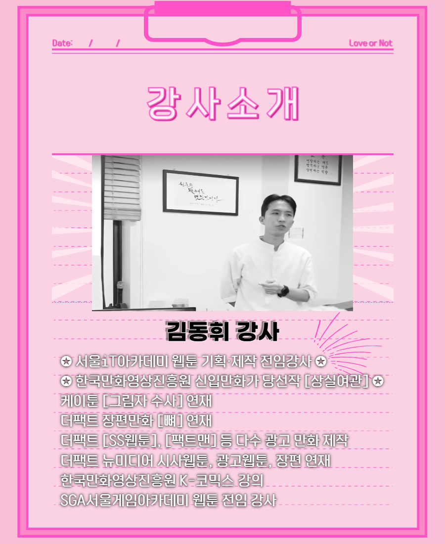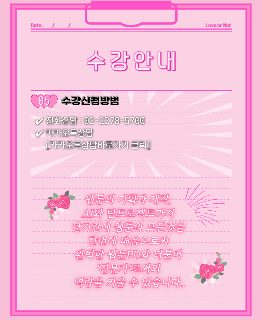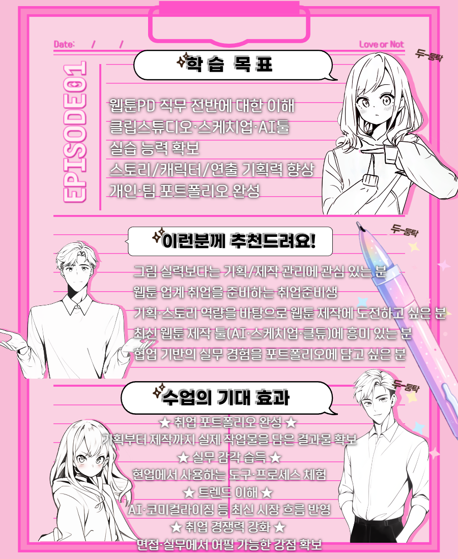 웹툰PD가 되기 위해 필요한 기획·스토리·제작 이해도를 8주 안에 완성합니다.