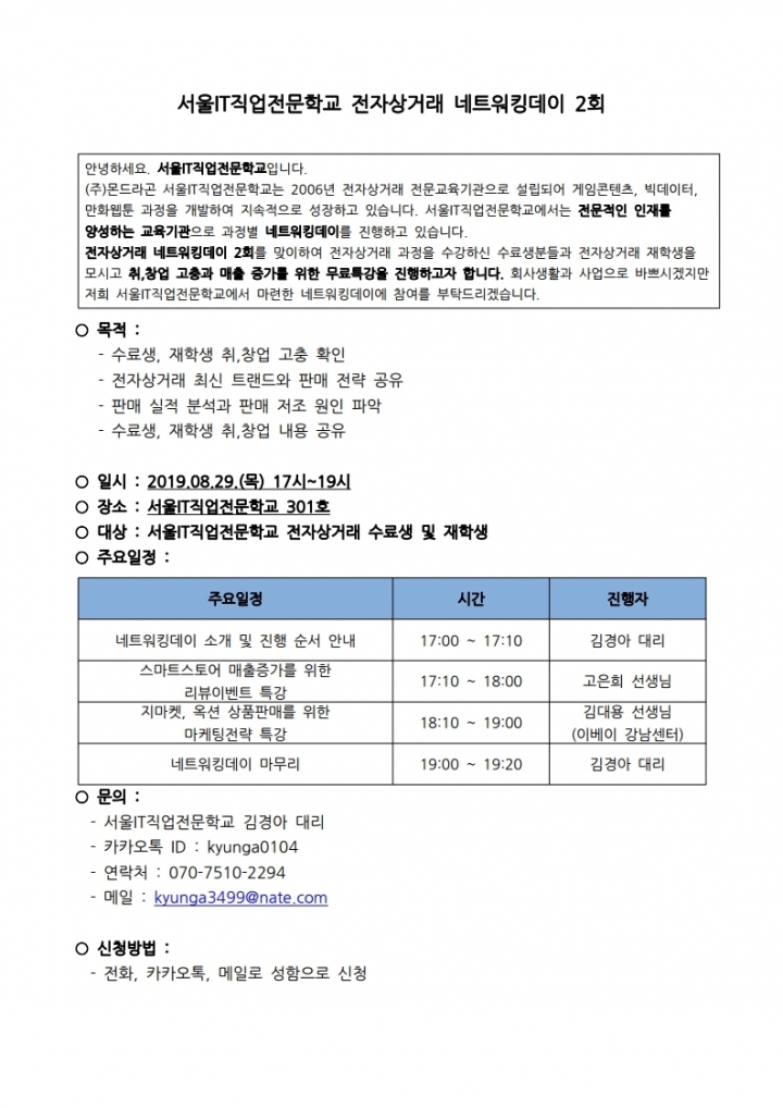 ÀüÀÚ»ó°Å·¡ ³×Æ®¿öÅ·µ¥ÀÌ 2ȸ¸¦ ¸ÂÀÌÇÏ¿© ÀüÀÚ»ó°Å·¡ °úÁ¤À» ¼ö°ÇϽмö·á»ýºÐµé°ú ÀüÀÚ»ó°Å·¡ ÀçÇлýÀ» ¸ð½Ã°í Ãë,â¾÷ °íÃæ°ú ¸ÅÃâ Áõ°¡¸¦ À§ÇÑ ¹«·áƯ°À» ÁøÇàÇϰíÀÚ ÇÕ´Ï´Ù. ȸ»ç»ýȰ°ú »ç¾÷À¸·Î ¹Ù»Ú½Ã°ÚÁö¸¸ ÀúÈñ ¼¿ïITÁ÷¾÷Àü¹®Çб³¿¡¼ ¸¶·ÃÇÑ ³×Æ®¿öÅ·µ¥ÀÌ¿¡ Âü¿©¸¦ ºÎʵ叮°Ú½À´Ï´Ù.